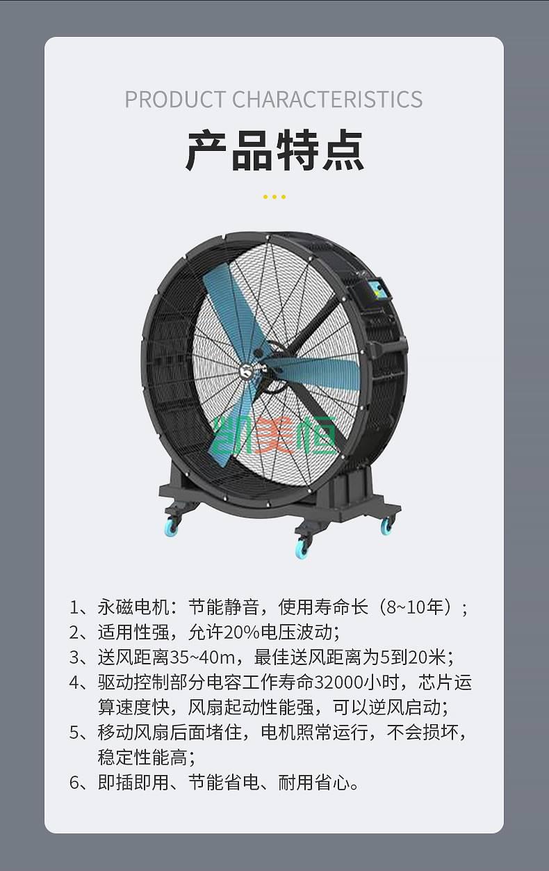 2. 高可靠性:永磁工業大風扇采用全封閉式結構,防護等級高,可在惡劣環境下長時間穩定運行,故障音:永磁工業大風扇采用高精度軸承和優化的風扇葉片設計,運行噪音低,不會影響工作環境。